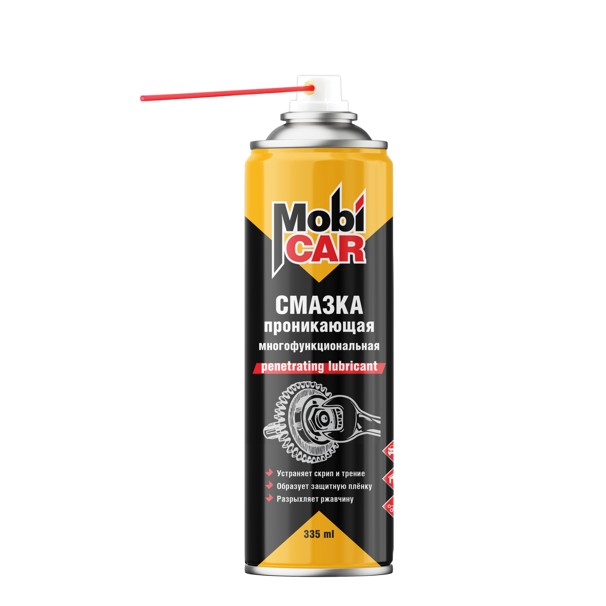 Многофункциональная проникающая смазка MobiCAR® 335 мл предназначена для смазывания подвижных механизмов и деталей, а также для эффективной защиты от влаги и коррозии металлических поверхностей. Применяется для обработки шестерёнок, замков, цепей передач, слабонагруженных подшипников и т. п. при уходе за автомобилем, в быту и промышленности.